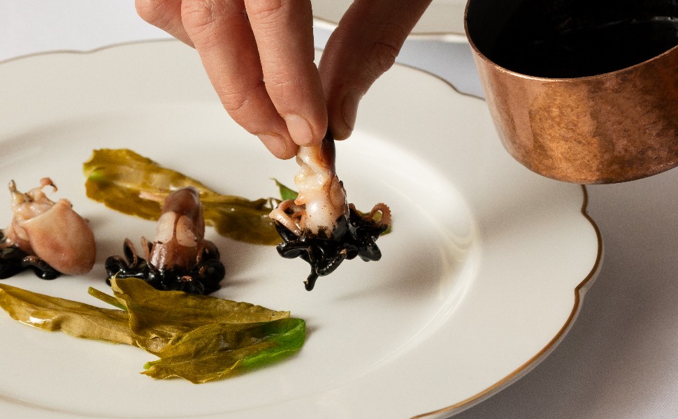 Si le geste demeure, l’assiette, elle, a évolué. Longtemps riche et opulente, elle s’est allégée, nourrie par des influences à l’image de celles du Chef italien. Une évolution qui ne trahit pas l’essence de la haute gastronomie française : « C’est une cuisine bourgeoise, de produit et de sauce, et qui doit être réconfortante », affirme-t-il. Là où certains peinent à revendiquer cet héritage, lui l’assume pleinement. « Il ne s’agit pas d’opposer tradition et modernité », souligne-t-il. Sa démarche n’est pas de revisiter, mais de s’appuyer sur la mémoire collective : « Je prends la cuisine française comme point de départ et je crée ensuite mes propres recettes, guidé par l’instinct et l’expérience ». Comme en témoigne cette création : une sauce aux trois poivres, déglacée au cognac et liée d’une touche de crème, qui accompagne une langoustine grillée et un ris de veau croustillant. Une inspiration créative du classique filet de boeuf, convoquant les marqueurs bleu-blanc-rouge sans jamais rejouer l’original.